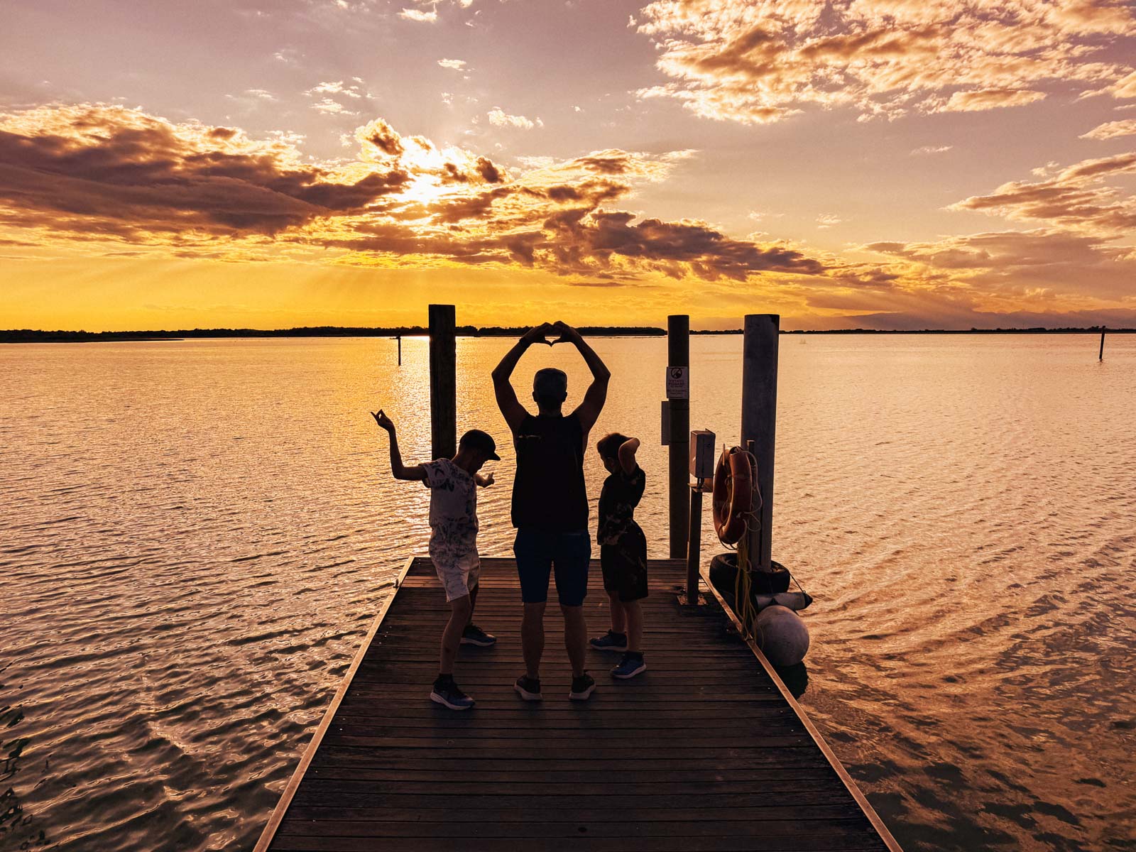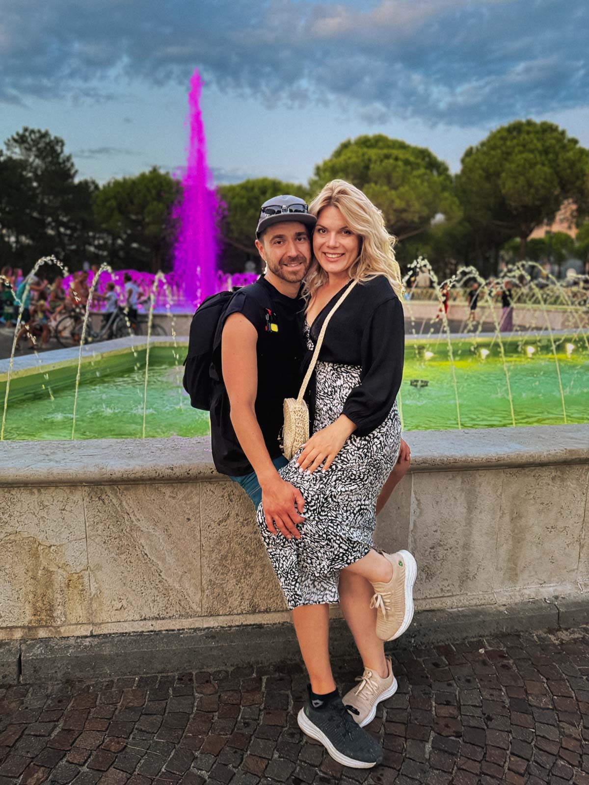 Wieczorem postanowiliśmy zobaczyć zachód słońca w Bibione Pineda, gdzie laguna, port i drewniany pomost tworzą niezwykle malowniczy krajobraz. Spacerując wśród zieleni, mogliśmy podziwiać spokojną taflę wody, a dzieci z radością biegały po pomoście. To miejsce, które warto odwiedzić, szczególnie gdy dzień zbliża się ku końcowi – kolory nieba i odbicia w wodzie tworzą magiczną scenerię. Po drodze zatrzymaliśmy się jeszcze przy fontannie, która wieczorem rozbłyska kolorowymi światłami. To właśnie tutaj powstały nasze ulubione pamiątkowe zdjęcia z wyjazdu.