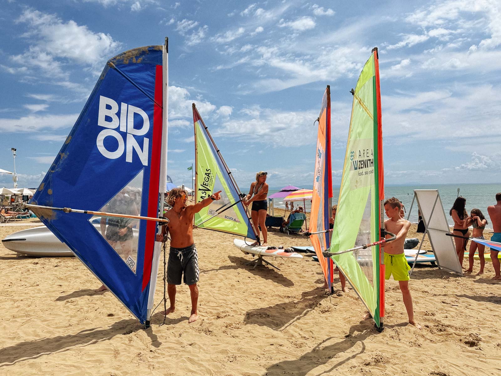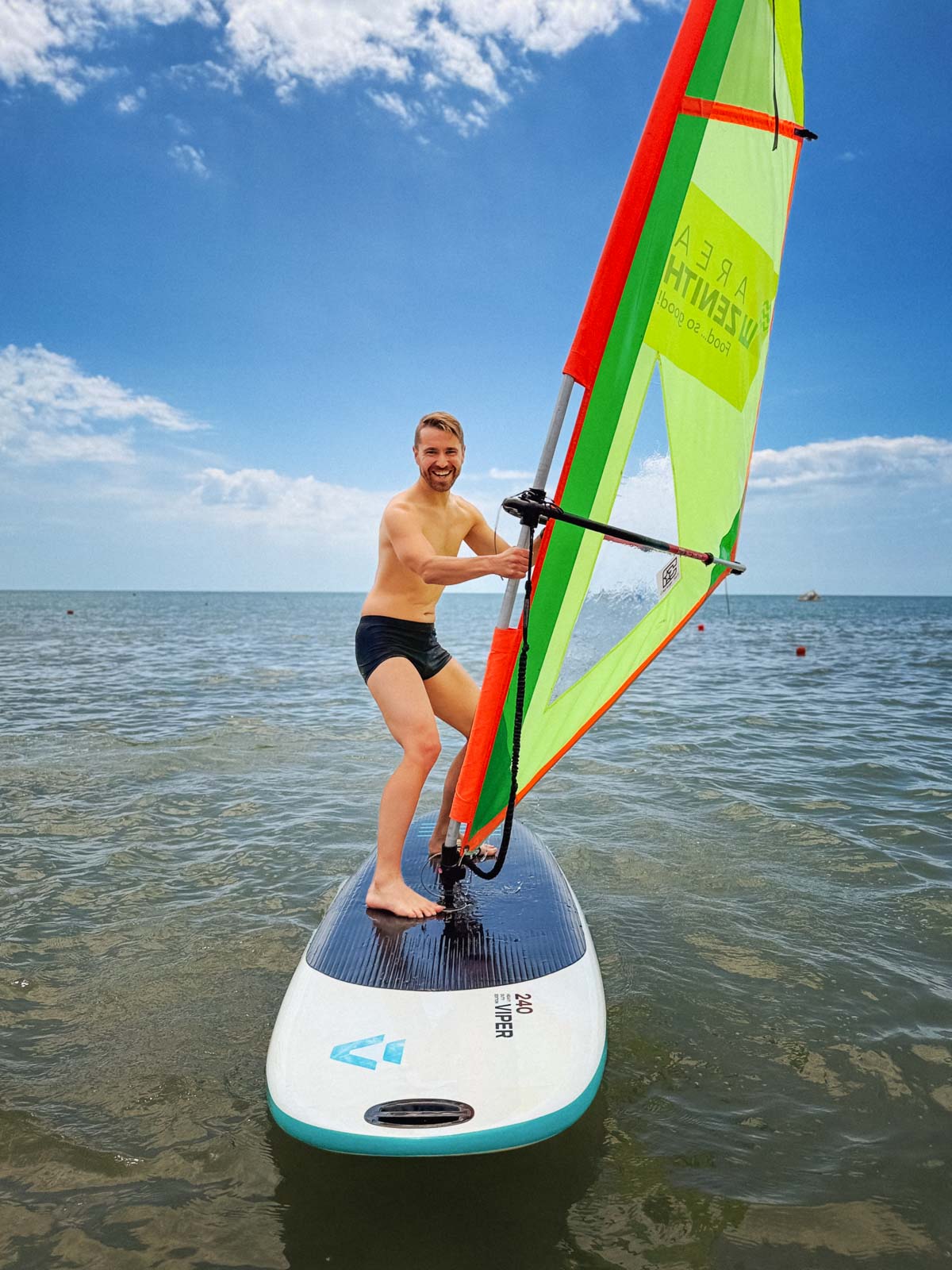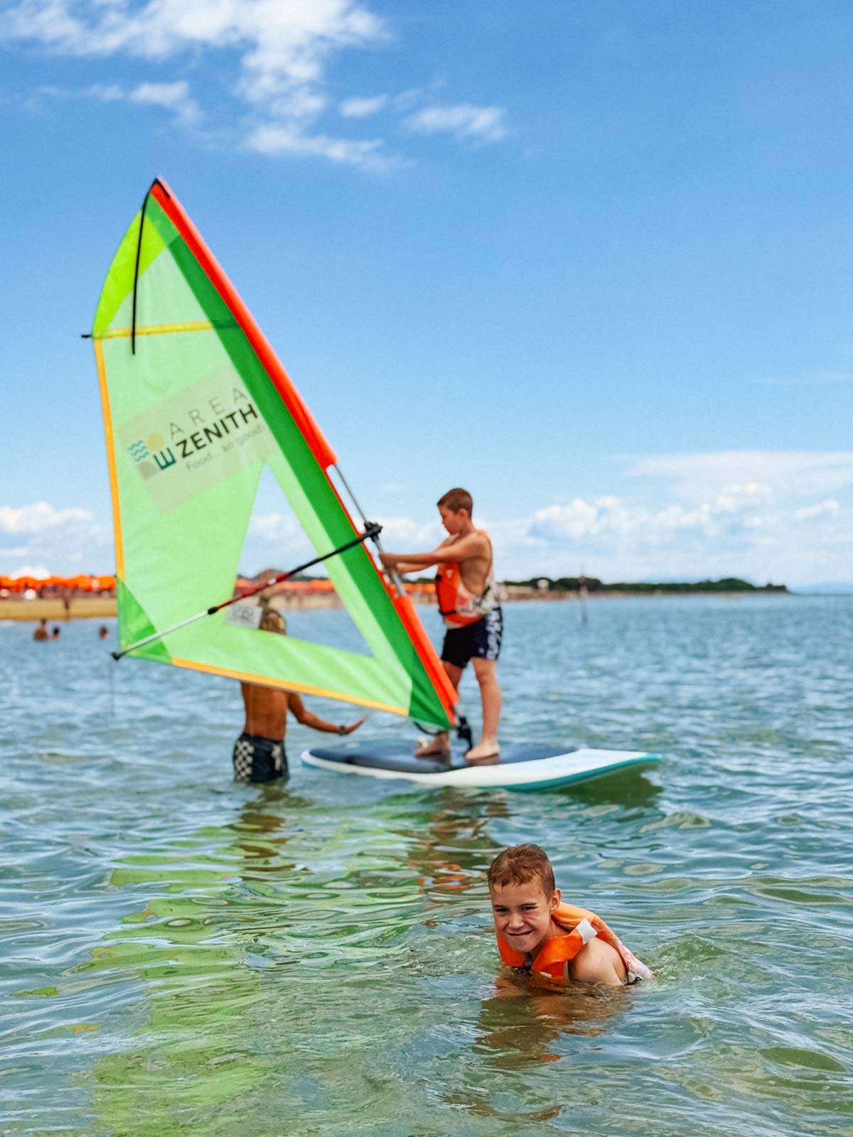 Kolejny dzień rozpoczęliśmy od porannego spaceru na plażę przy latarni morskiej Faro di Punta Tagliamento. Mario i Aria nie mogli doczekać się pierwszych promieni słońca, a my podziwialiśmy widok na morze i charakterystyczną sylwetkę latarni. Po śniadaniu ruszyliśmy na lekcję windsurfingu w szkole Tornado Bibione. Instruktorzy cierpliwie tłumaczyli nam podstawy, a pierwsze próby na wodzie, choć niełatwe, przyniosły mnóstwo śmiechu i satysfakcji.