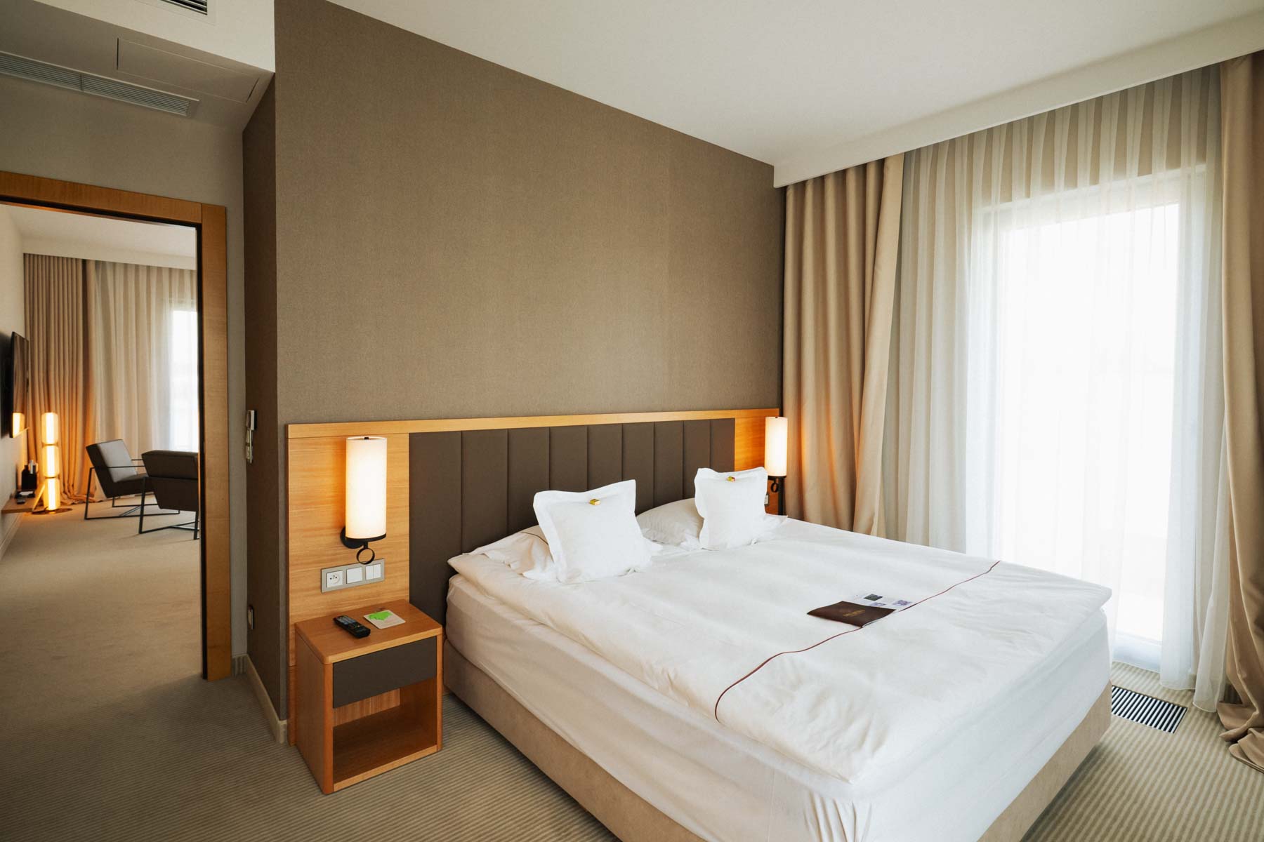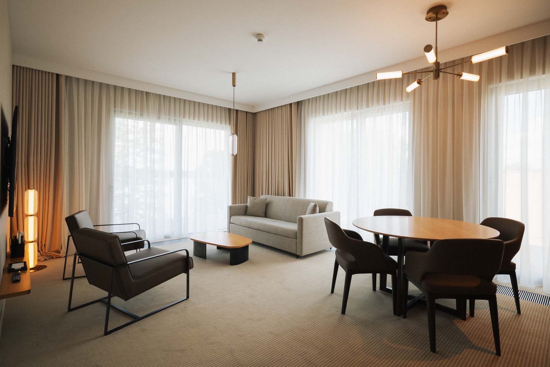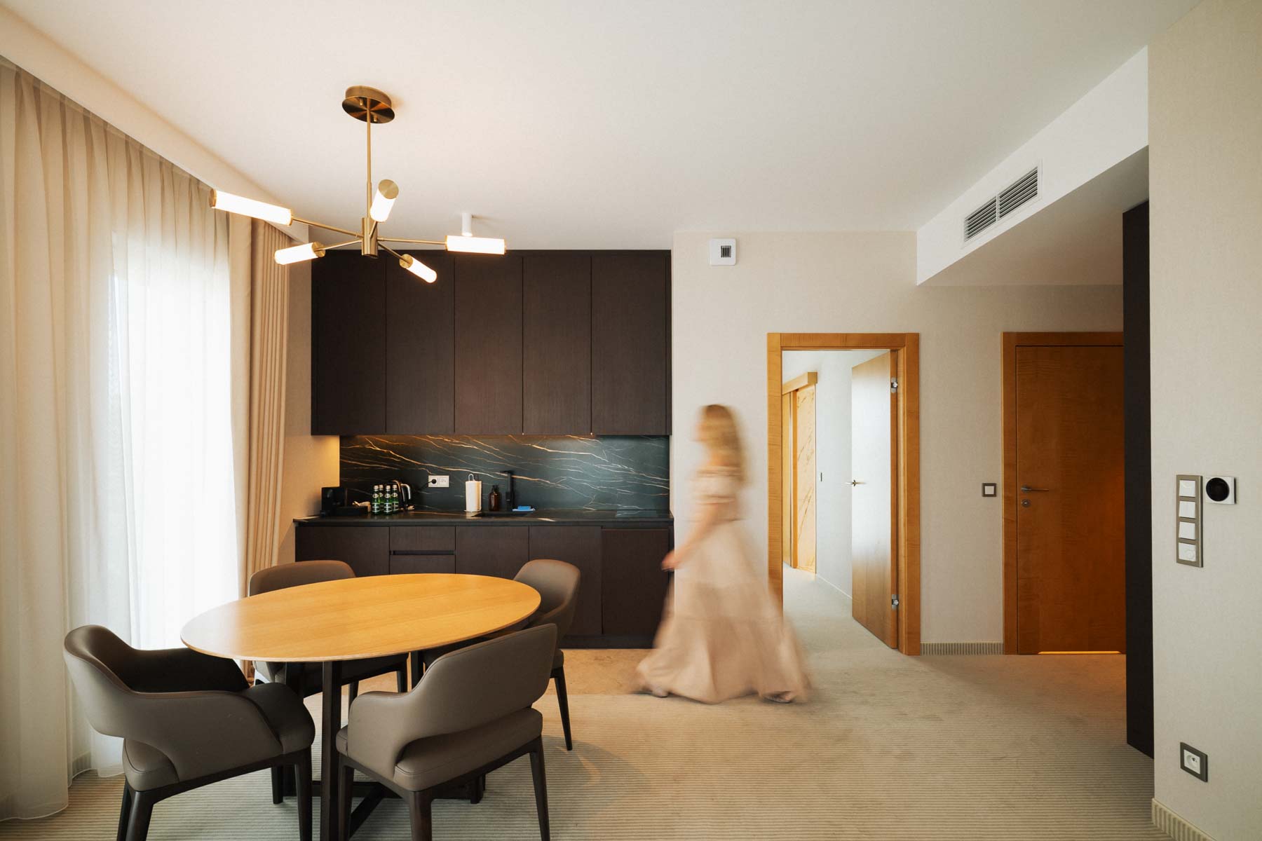 Apartamenty to oddzielny budynek tuż obok Grand Hotelu Tiffi, więc zyskujecie pełną prywatność, a jednocześnie dosłownie dwa kroki dzielą Was od hotelowego spa, basenów, siłowni i restauracji. Nasz apartament Grand miał dwie sypialnie, wygodny, jasny salon i genialny balkon z widokiem prosto na jezioro — idealny na poranną kawę albo wieczorny chill. Fajna sprawa: w aneksie kuchennym znajdziecie sprzęty SMEG i wszystko, co potrzeba, żeby samemu przygotować rodzinny obiad. Całość daje super komfort i kameralny klimat.