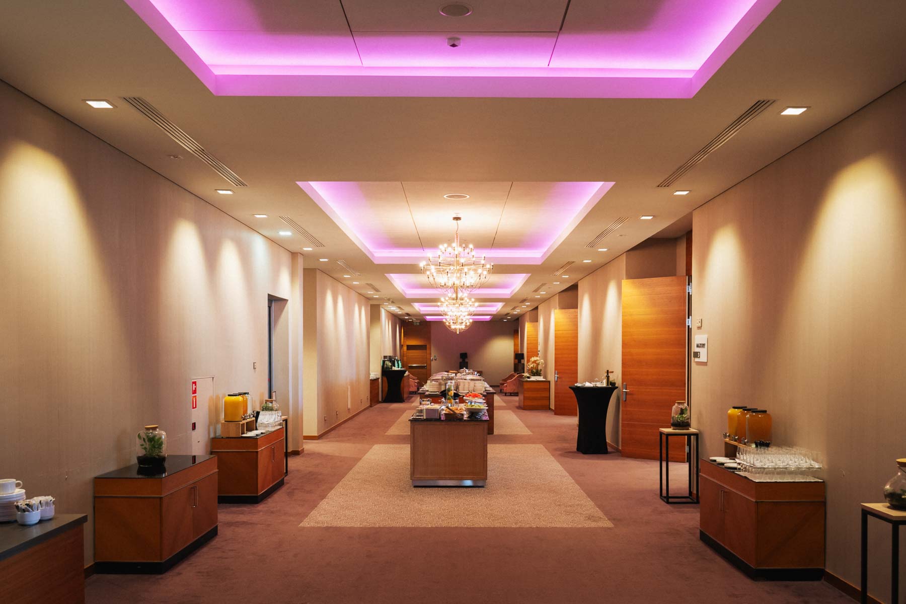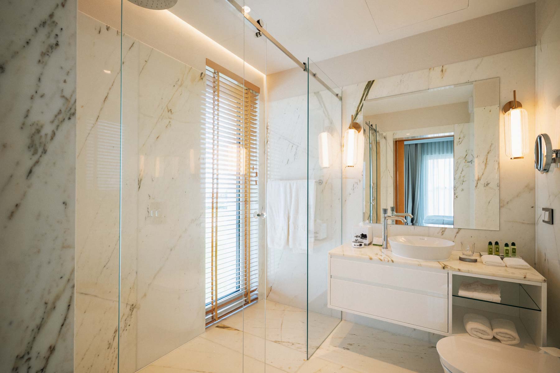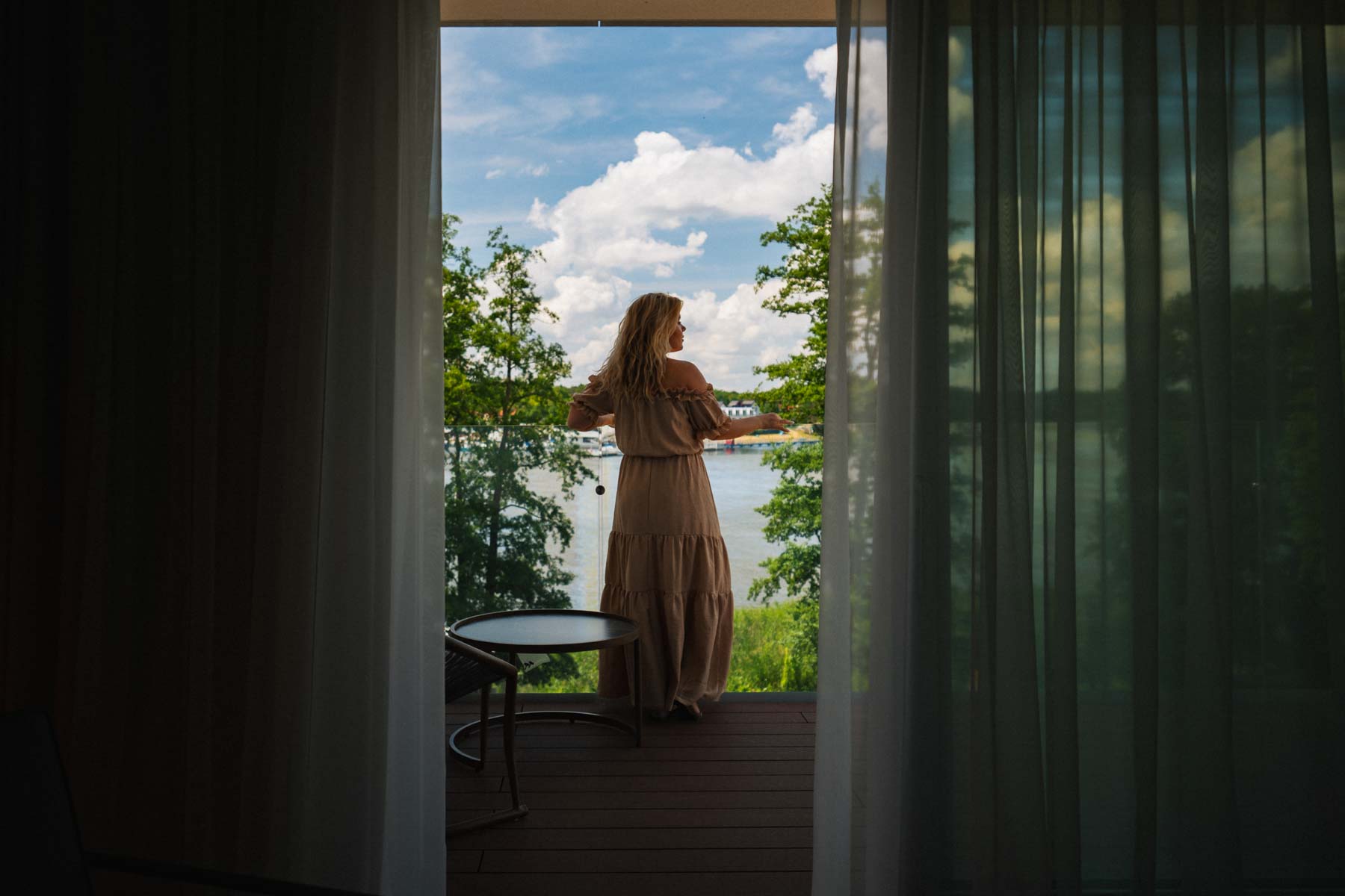 Apartamenty to oddzielny budynek tuż obok Grand Hotelu Tiffi, więc zyskujecie pełną prywatność, a jednocześnie dosłownie dwa kroki dzielą Was od hotelowego spa, basenów, siłowni i restauracji. Nasz apartament Grand miał dwie sypialnie, wygodny, jasny salon i genialny balkon z widokiem prosto na jezioro — idealny na poranną kawę albo wieczorny chill. Fajna sprawa: w aneksie kuchennym znajdziecie sprzęty SMEG i wszystko, co potrzeba, żeby samemu przygotować rodzinny obiad. Całość daje super komfort i kameralny klimat.