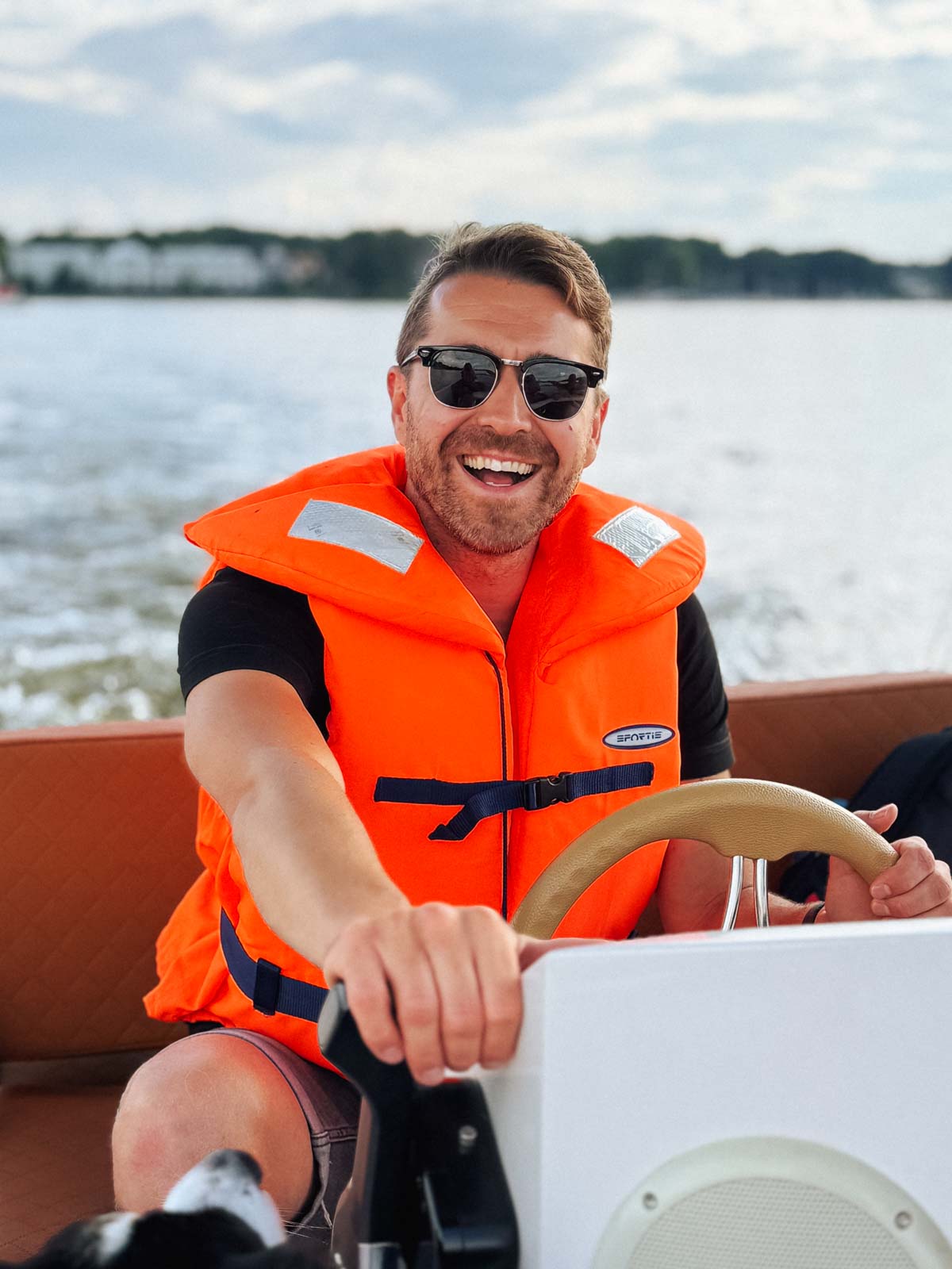 Wypożyczalnia „Na Wiatr” jest tuż przy hotelu, więc wystarczyło dosłownie kilka kroków, by być już na pokładzie. Chłopcy wskakiwali do wody, sterowali łódką i w niecałą godzinkę opłynęliśmy największą śródlądową wyspę w Polsce Wielką Żuławę. Zobaczcie sami, ile było radości!
