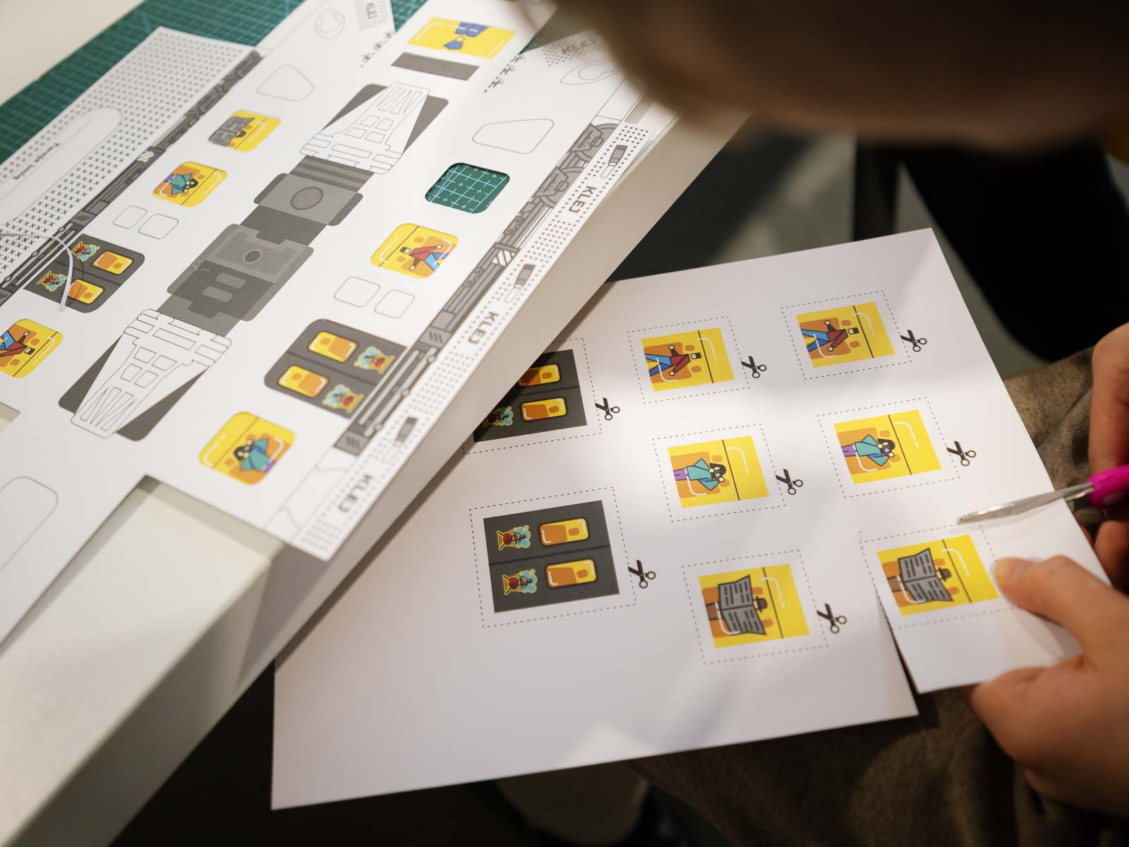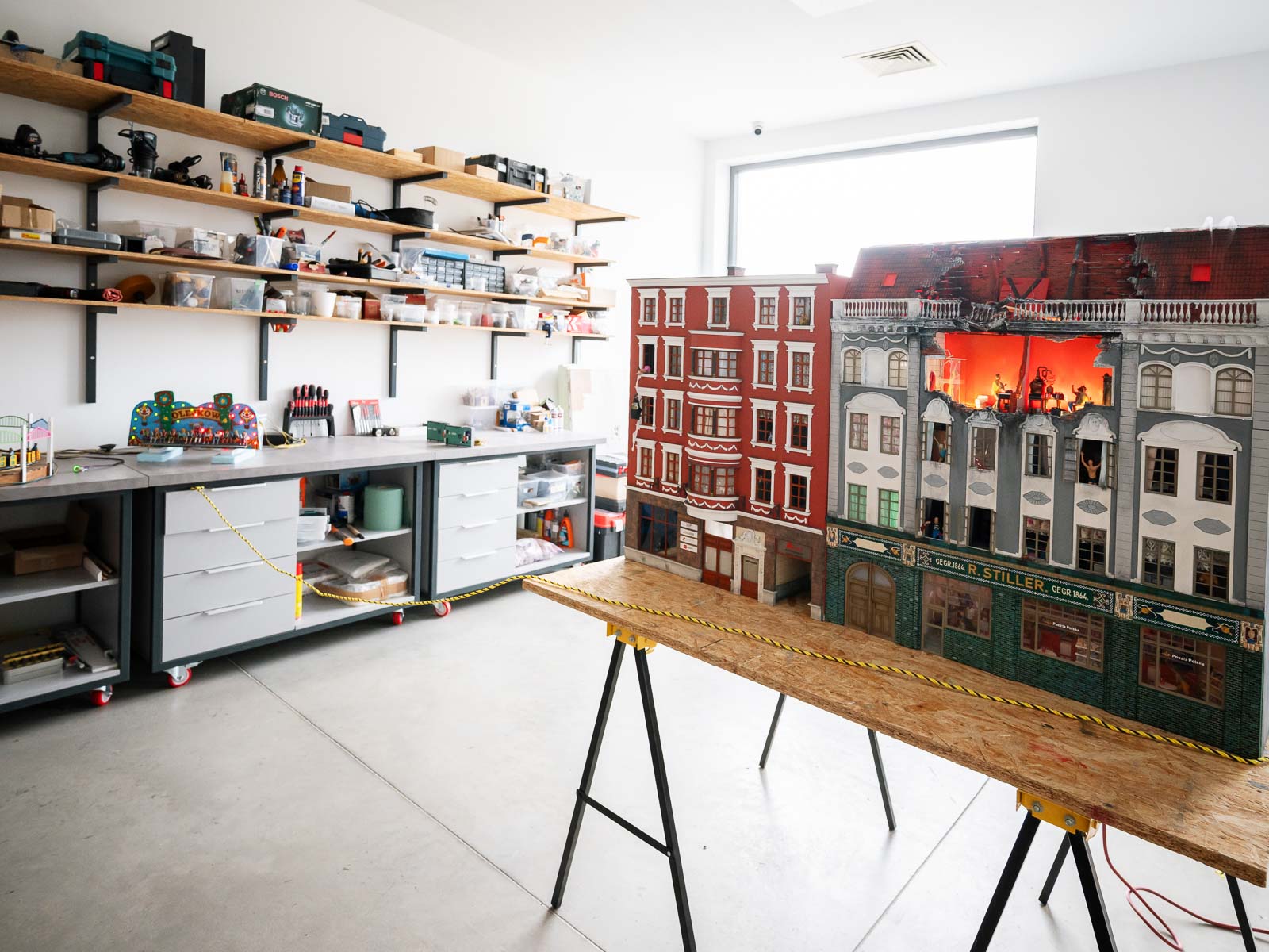 Obiekt zwiedzasz z przewodnikiem co 30 minut, np. 12:00, 12:30 i 13:00, zaczynając oczywiście od godzin porannych i kończąc o godzinie 17:00. Modelarnia otwarta jest do 18:00, więc ta godzina przeznaczona jest na ostatnie wejście. Na początku poznajemy historię i tradycje modelarstwa w Jeleniej Górze na przykładzie małej gablotki i kilku zdjęć, a następnie wchodzimy na teren obiektu. Koniecznie zadbajcie o to, by Wasze dzieci dostały wyszukiwarkę – dzięki temu wizyta będzie dla nich bardzo zajmująca. Po przejściu przez mały przedsionek z mappingiem podchodzimy do stołu, przy którym można – a wręcz należy – wszystkiego dotknąć. Dowiemy się tam, z czego zbudowana jest trawa, skały oraz woda. Kolejnymi ważnymi elementami jest wejście do dwóch pomieszczeń: jedno, w którym tworzone są przedpremierowe makiety (np. pożar w jednej z wrocławskich kamienic), oraz miejsce, gdzie malowane są figurki. W ten sposób możemy podpatrzeć, jak wygląda praca w Kolejkowie od kuchni. Ciekawym momentem jest też obejrzenie krótkiego filmu na temat modelarstwa i jego rozwoju (np. w filmie lub otaczającym nas świecie) oraz zajrzenie pod makietę. To mnóstwo informacji na temat prędkości, skali, oświetlenia i wprawiania w ruch wszelkich elementów. Na koniec mamy jeszcze czas, aby w spokoju poszukać wszystkich elementów z wyszukiwarki. Nasi chłopcy nie chcieli odpuścić i finalnie – trochę z pomocą pani przewodnik – udało nam się znaleźć wszystkie zwierzęta i figurki. W sklepiku kupiliśmy pierniczka oraz lizaka na pierwszy głód i ruszyliśmy na warsztaty. Jak one przebiegały, opiszę nieco niżej.