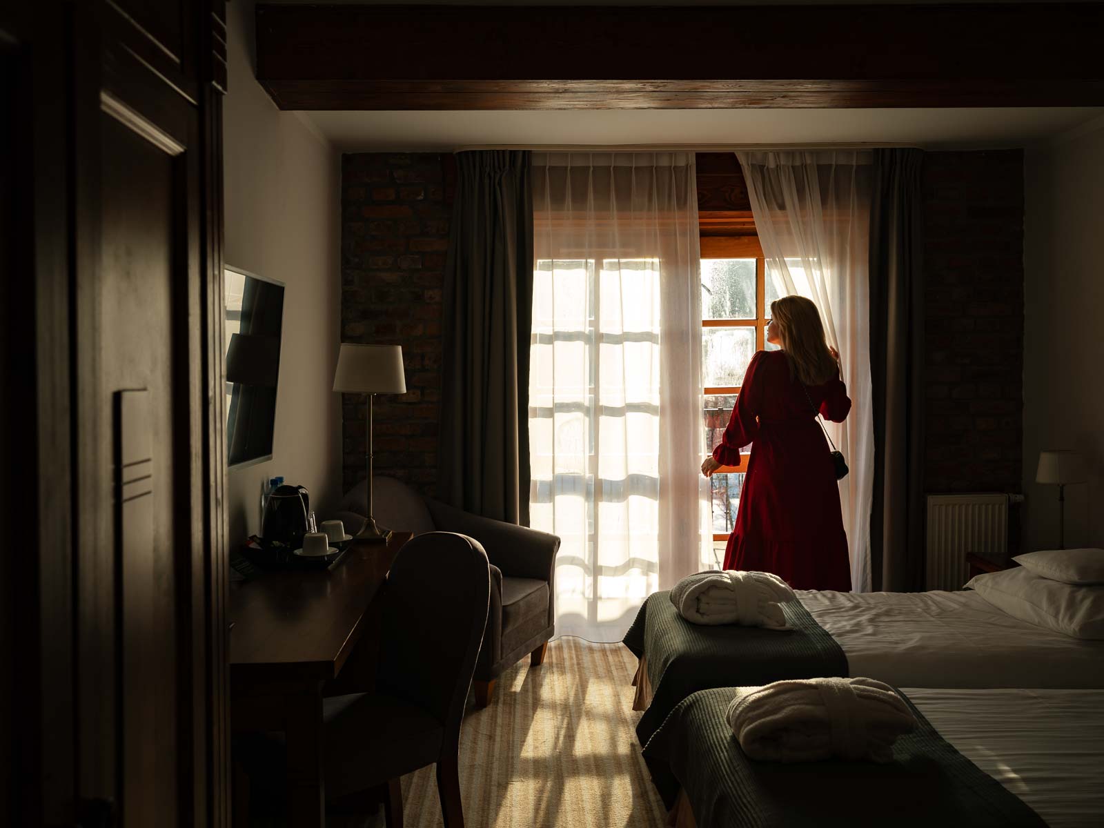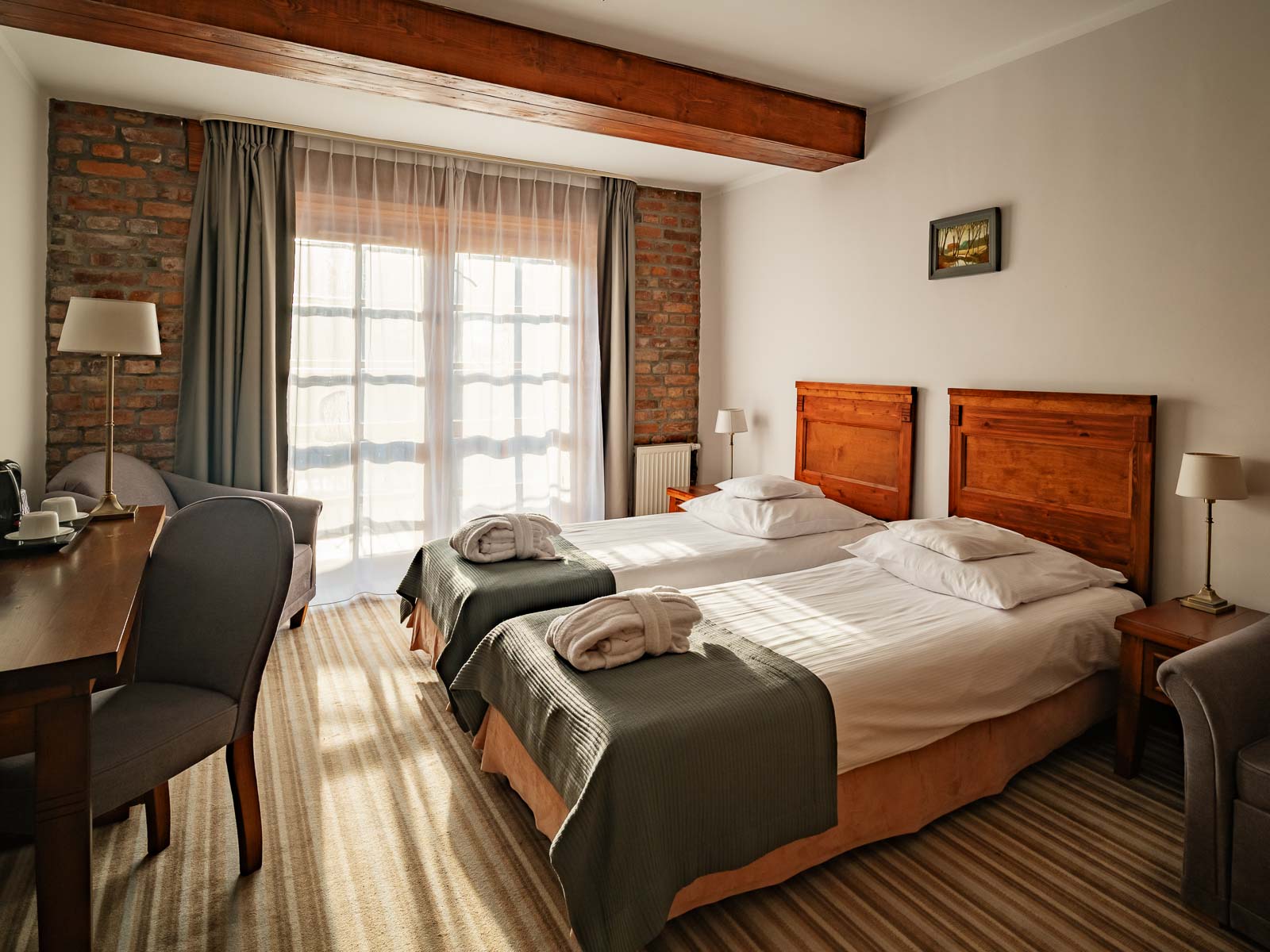 W ofercie TRIVERNA znajdziecie pokoje 2-osobowe, z łóżkiem małżeńskim (double) lub dwoma oddzielnymi (twin), z balkonami wychodzącymi na las i jezioro lub bez nich. Wszystkie urządzone są w podobnym stylu, w którym dominuje drewno, cegła i stonowane dodatki. Pokoje mają 27 m², a na wyposażeniu znajdziesz: TV, sejf, lodówkę i czajnik; w szafie: sejf, szlafroki i kapcie (w tym również dla dzieci); a w łazience: ręczniki, suszarkę do włosów oraz zestaw kosmetyków.
